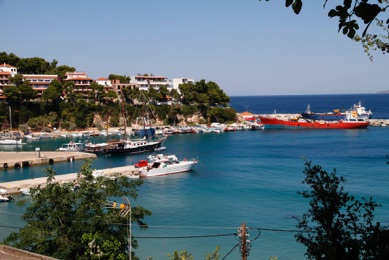 Neden for er en flok mænd ved at læsse stykgods fra en rød coaster. En lastvogn med en ung mand på ladet kører i rutefart med en sending køleskabe til øens beboere. En af Hellenic Seaways katamaraner stryger uden om coasteren med passagerer fra Volos, Skiathos og Skopelos. Senere på dagen lægger de større færger til herude.