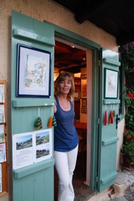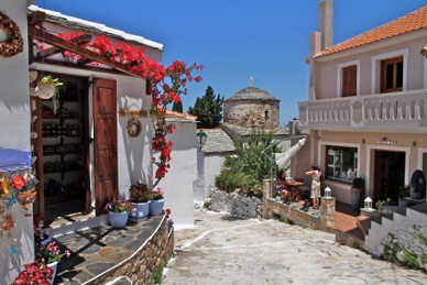 Danske Bente Keller var en af de første med et galleri heroppe. Udover at sælge bivokslys og egne akvarelmalerier afholder Bente malekurser med den meget pittoreske bjergby som kulisse (bentekeller.gr). Hun har boet her siden 1995. Med sin græske mand Elias Tsoukanas har hun sønnen Jason på 10. De kender Alonissos så godt, at de sammen har udgivet de glimrende guidebøger Alonissos on Foot og The Alonissos Guide.
