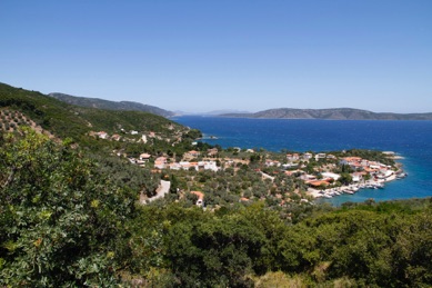 På vejen derud kommer jeg forbi øens øvrige to lidt større bebyggelser. Ca 10 km fra Patitiri er det Steni Vali med flere taverner og en lille havn, der deles mellem lyst- og fiskerbåde. Yderligere et par kilometer efter kommer fiskerflækken Kalamakia med 3-4 taverner og en lille flåde af fiskerbåde. Her snupper jeg en forfriskning og får serveret en meget salt sild til. Fiskerne skæver lidt til mig, men en nordbo skulle vel nok kunne klemme en enkelt saltsild ned.