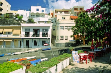 Adelmo kører mig ned til turistcentret Puerto Naos. Her er der ikke meget lokalmiljø. Til gengæld en pragtfuld beliggenhed midt i store bananplantager med øens fineste badestrand ud for hotellerne. Det store luksushotel Sol Elite dominerer den ene ende af stranden.