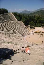 Vi aser os op på bageste række og kan som mange tusinde turister før os konstatere, at akustikken er så fin, at man kan høre en mønt falde til jorden langt nede på scenen. De nederste 34 rækker stammer helt tilbage fra det 4. århundrede før Kristi. De øverste 24 blev bygget til senere under romerne. Om sommeren er Epidaurus-teatret centrum for en stor teaterfestival.