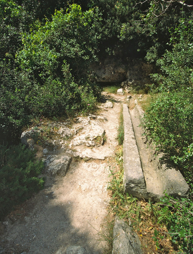 For at nå hen til Djævelens Bro må jeg stille scooteren. En smal sti fortsætter frem langs en dyb slugt. Troizen var i sin tid beskyttet af slugter på to sider, et bjerg i baggrunden og en stejl skråning ned mod sletten og havet.