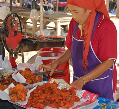 Vores kyllingebus standsede ved et lille marked, hvor guiden gjorde indkøb af frisklavede grillspyd og grøntsager. Maden blev pakket ud og indtaget ved langbordene i udendørskantinen på en landsbyskole. På grund af ferie fik vi desværre ikke mulighed for at tale med en lærer eller kigge ind i klasselokalerne.