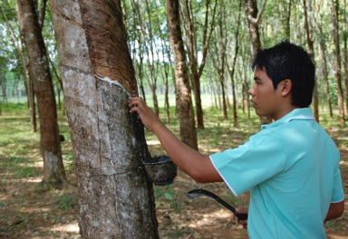 I en gummiplantage så vi, hvordan gummien bliver tappet. Plantagearbejderen skærer et langt snit rundt om stammen. Lidt længere nede anbringer han en halv kokosnød eller anden beholder, og næsten øjeblikkeligt begynder der at løbe latex ned i beholderen. Latexen er en sej, hvid væske, som efter tapningen bliver koncentreret. Gummitræerne ”tappes” hver morgen kl. 4-6, når det er køligst, og en enkelt mand siges at kunne klare ca. 1200 træer pr. dag. Det tog undertegnede hele fem minutter at flænse og hakke og gøre sig til grin, før den første dråbe latex kom til syne.