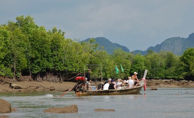 Dagens sidste programpunkt – bortset fra et stop ved et stort, lokalt marked med alverdens dagligvarer til ingen penge – foregik til søs. Fra junglen bevægede vi os ud i longtail-boat gennem mangroveområder, hvor vi spottede både aber, øgler, slanger og mange forskellige fugle. En del af turen måtte skipperen stage os frem, fordi vi gik på grund under lavvandet.