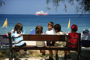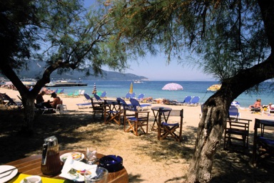 Bystranden med skyggefulde træer bliver hurtigt et foretrukent formiddagssted for min kone. Strandbaren “The Drift” med fin service mellem liggestolene passes af Thomy og Christos og deres sprællemand af en søn, Vasilis.