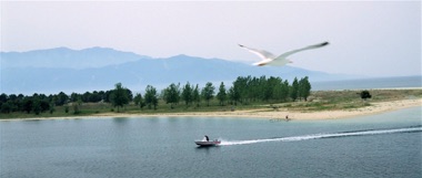 Vi stryger gennem landsbyen Maries på en kraftig scooter. Bag byen gør vi holdt ved en lille opdæmmet sø med et specielt grønt skær. Pinjeskoven når helt ned til søens bredder. Her er fredfyldt og frodigt. Vi hilser lige på en lille lastvogn med landarbejdere. Det er de sidste mennesker, vi ser i 2 1/2 time!