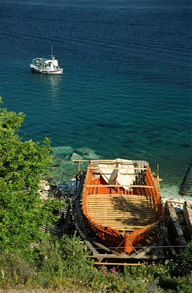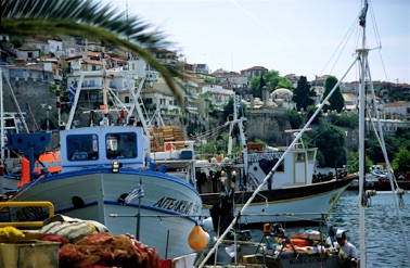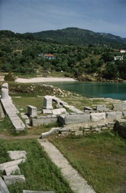 Stranden slutter ved et lille skibsværft. Går man gennem det og et lille strandområde med en hyggelig taverne, kan man begive sig op til det antikke teater langs den gamle bymur. Muren var oprindeligt 4 km lang og opført 600 år før Kristi fødsel. Yderbelægningen har været i det hvideste marmor.