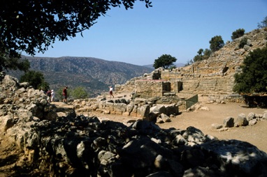 Vejen svinger ind mellem nogle klipper kort efter Kasteli. Nu går det i skrappe hårnålesving ned mod “storbyen” Neapolis. Jeg må simpelthen stille scooteren og nyde udsigten. I baggrunden bjergene, der skjuler Kretas største højslette Lasithi. På bjergsiderne er der små landsbyer mellem svært opdyrkelige marker. I bunden af dalen løber hovedvejen mellem Agios Nikolaos og Heraklion.